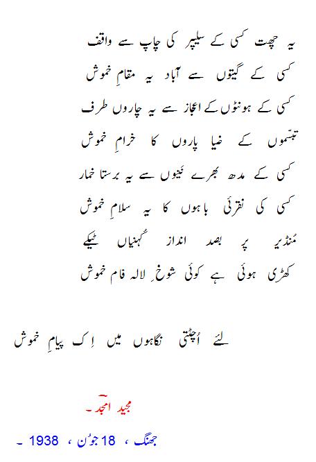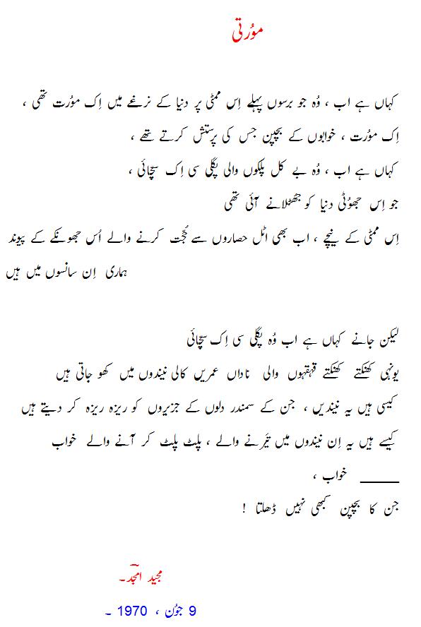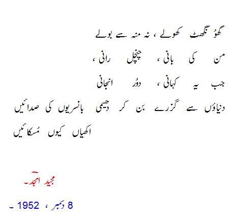 Majeed Amjad (1914-1974) is arguably among the top 5 modern Urdu poets. He has written poems, long poems, ghazals as well as geet (songs).