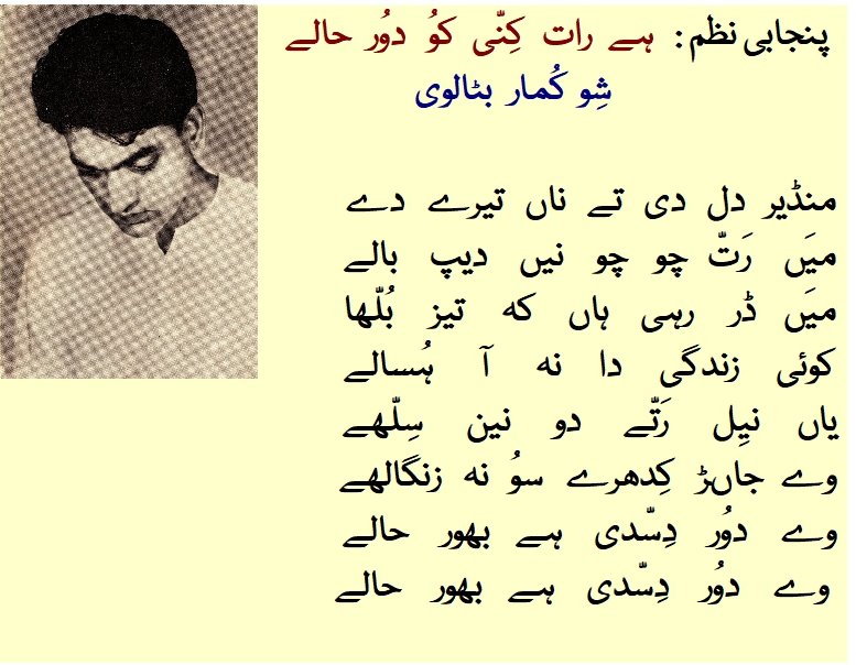 Shiv Kumar Batalvi (1936-1973) was born (July 23rd, 1936) in a Brahmin Hindu household and grew up in a small Punjab village called "Baraa Pind Lohtiyaa (District Shakargarh, present day Pakistan) in the dying days of the British Raj in India.