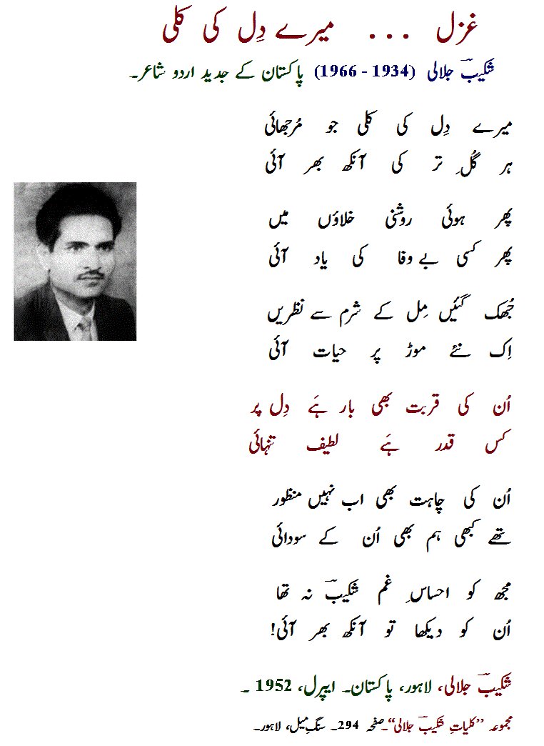 Shakaib Jalali (1934 - 1966) was a modern Urdu poet from Pakistan who wrote Urdu ghazals with a modern era sensibility.