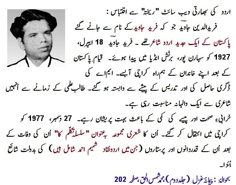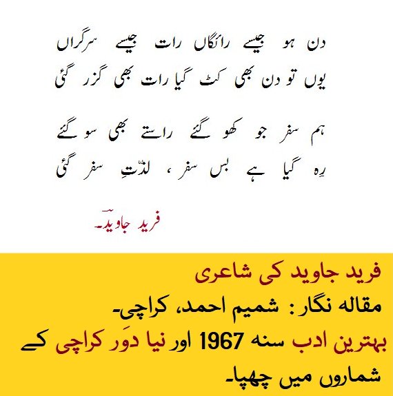 That day, Ghalib Maamoon gave me a 1967 issue of "Behtareen Adab" (an annual literary publication that used to be published from Lahore regularly in the 1950's and 1960's) and directed me to read an essay on the poetry of a little known modern Urdu poet, Fareed Javed ... The article had been written by a Karachi-based Urdu critic Shameem Ahmed.