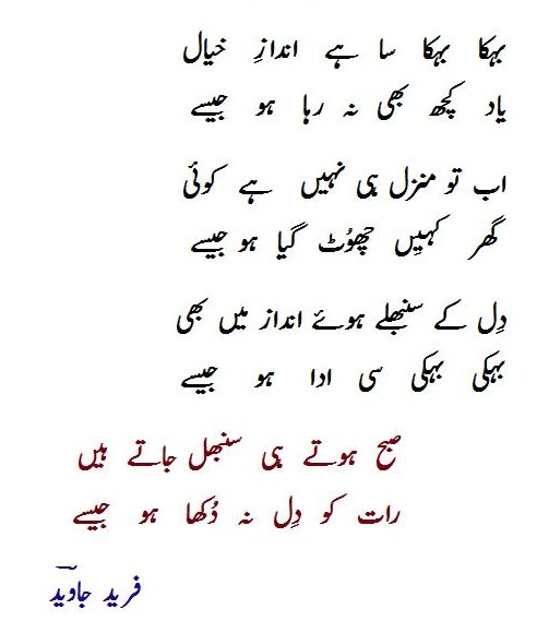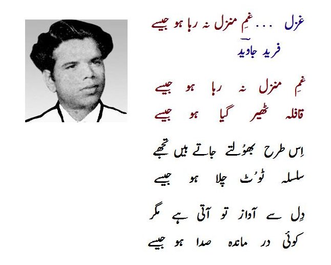 I present some Fareed Javed ghazals here from that article by Shameem Ahmed .... I also request Dareechah visitors to write to me via the Contact Us page in Dareechah if they have Fareed Javed's collection of ghazals in their possession so that I can upload more gems from his pen here.
