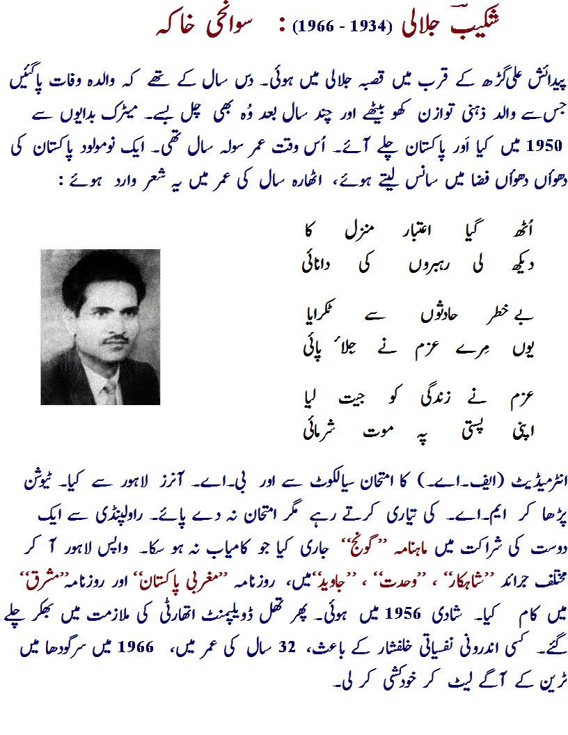 Shakaib Jalali (1934 - 1966)  was a modern Urdu poet from Pakistan who wrote Urdu ghazals with a modern era sensibility.